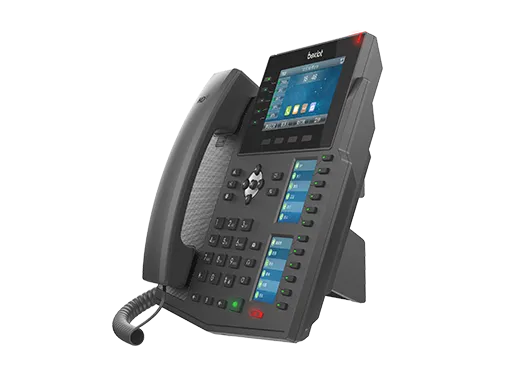 Equipado con con una pantalla a color de 4,3 pulgadas 480 × 272 y dos pantallas secundarias a color de 2,4 pulgadas 320 × 240, con una apariencia elegante de negocios y fácil operación. · Las teclas laterales en la pantalla principal con Los indicadores LED corresponden a las líneas SIP que se muestran en la pantalla, lo que proporciona una guía de operación más clara y conveniente. · Las teclas laterales en las pantallas secundarias con Los indicadores LED admiten funciones programables personalizadas para cumplir con los requisitos en varios escenarios de aplicación.